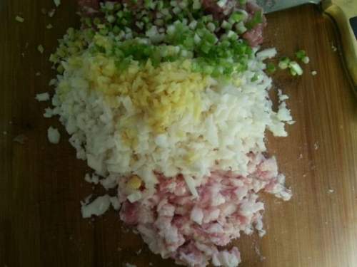 然后将肥瘦肉,马蹄、葱白、姜末放一起剁。剁至所有原料融合。