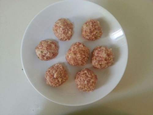 8然后把肉馅放在手心里,来回团几下,依次团好肉丸。在盘子里刷上一层植物油,将肉丸放盘子里。刷植物油为了防粘。做好的肉丸上火蒸10分钟。