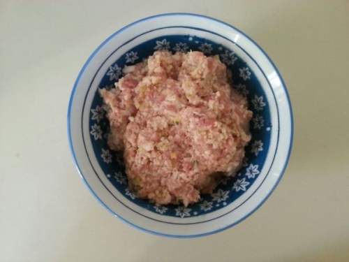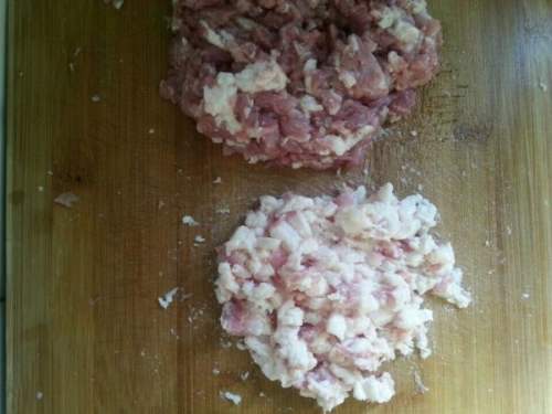 3猪腿肉400克。肥肉和瘦肉分开剁碎。