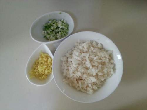 4然后将肥瘦肉,马蹄、葱白、姜末放一起剁。剁至所有原料融合。