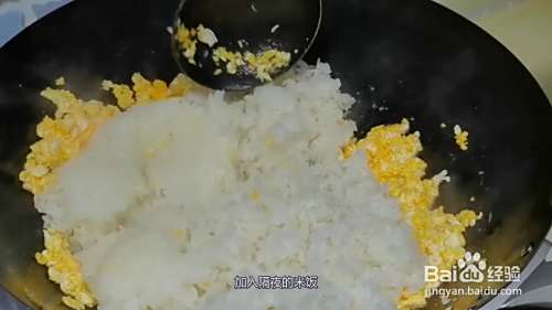 鸡蛋不打散,直接放入锅中,用炒勺打散后,加入隔夜的米饭,开翻炒均匀。