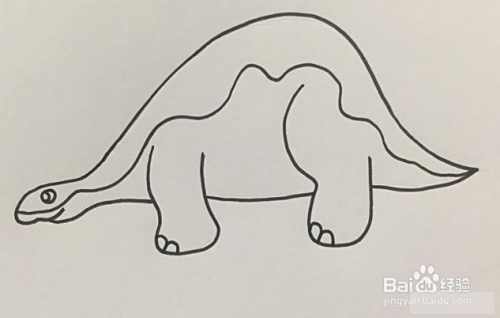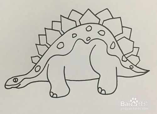 33、在头部画出剑龙的眼睛,腿上画出脚趾后,将背部的线条也画出来。