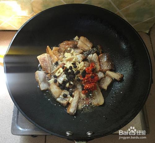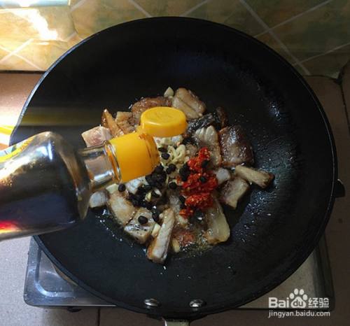 加入剁辣椒,黑豆豉,淋入生抽酱油和白糖,翻炒均匀后关火。