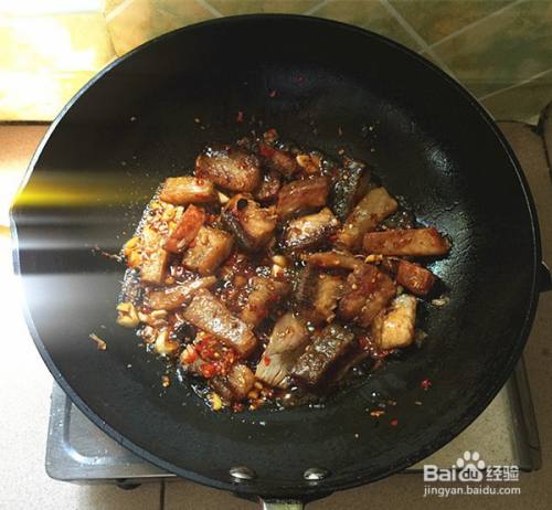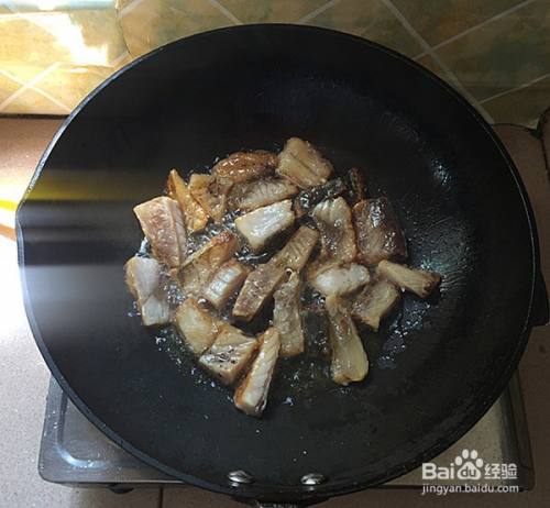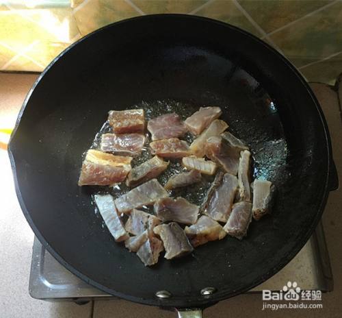 锅中注入菜籽油,5成热的时候,下泡好沥水的腊鱼。
