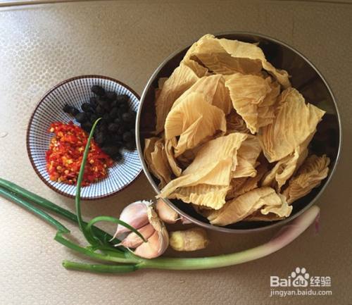 准备油豆皮一碗,葱姜蒜、剁椒、黑豆豉等配料备用,大蒜,生姜切末。