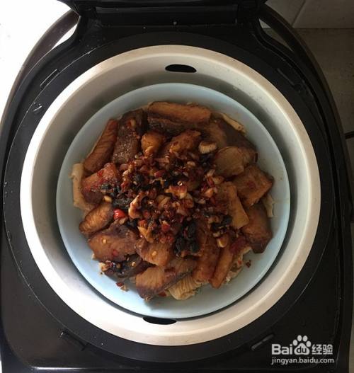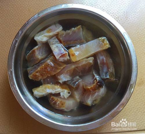 腊鱼清洗掉浮土后冲洗干净,控水后剁块下清水浸泡