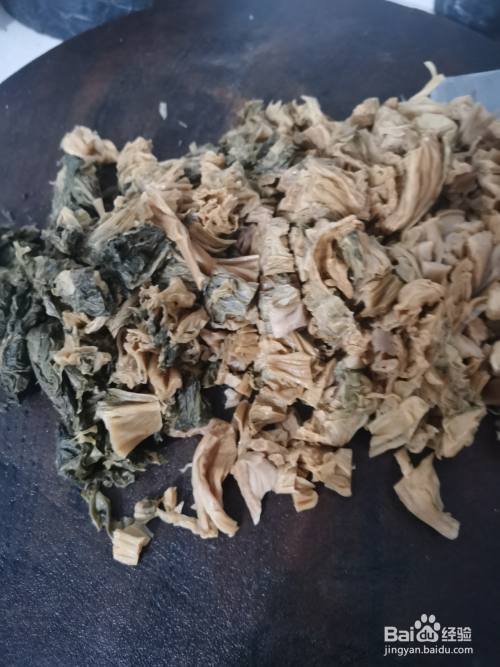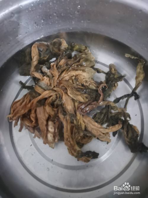 将酸菜花干泡发清水盆中,泡发好洗净切碎待用。
