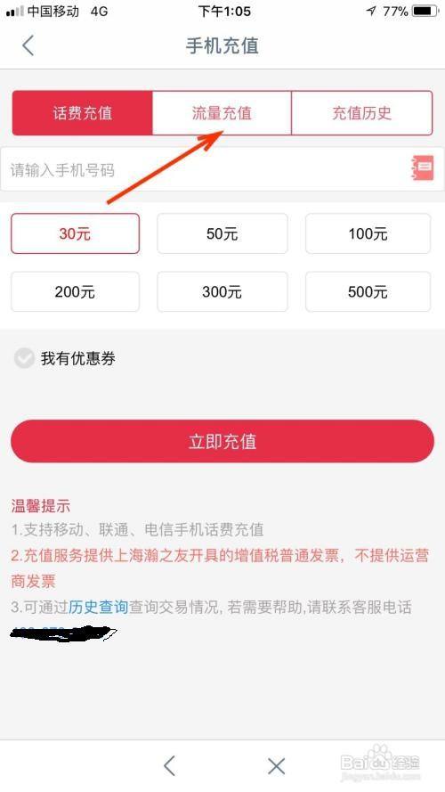 6. 点击一下流量充值按钮,按照提示操作即可。