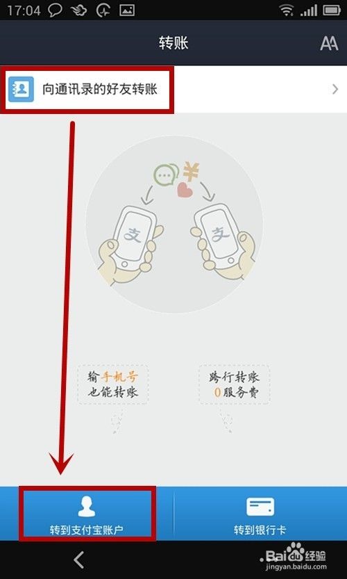 点击进去之后可以选择 通讯录好友,如果要转 账的对象不是通讯录好友,可以点击下面的转 账到支 付 宝账号。