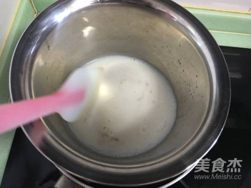 7将50克牛奶放入小锅中,加入软化后的吉利丁片(吉利丁片挤去水份),放在燃气上隔水加热,使吉利丁片完全融化,混合均匀,然后放凉备用。