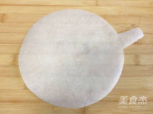 1先做准备工作:先用油纸剪一张和八寸蛋糕模具底一样大小的圆形,有一边留一点纸边。(如图)