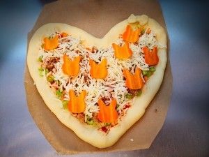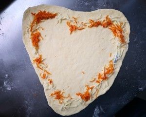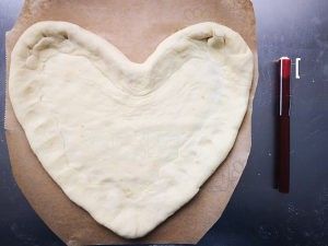 用面团外把它们包进去。包成心形。桃心的下面尖尖的地方会多出来一些面团,可以揪下来。放烤箱,活任何密闭空间里发酵。