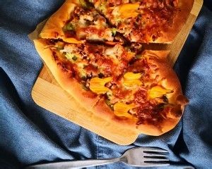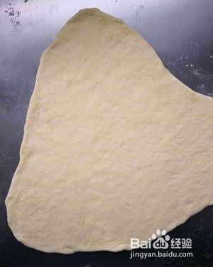 拿出来揉会儿到表面比较光滑。擀开,类似成三角形,把面皮转移到铺有烘培纸的烤盘上,撒上马苏里拉,想拉丝,多放图上两三倍的芝士量。也可撒上肉松。