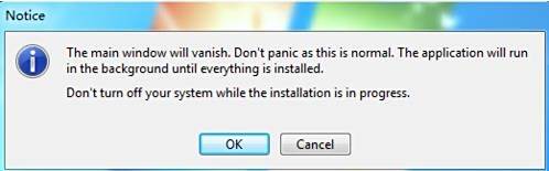 翻译过来就是:主窗口将会消失。不要慌张,这是正常的。应用程序将会在后台运行直到安装完成。安装进行过程中不要关闭你的系统。