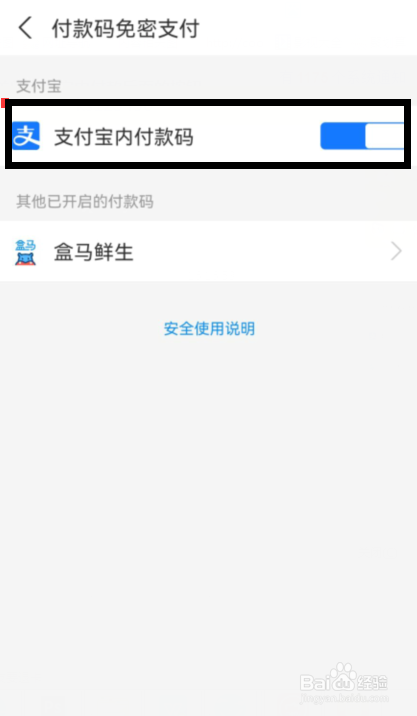 在付款码免密支付下,点击关闭支付宝内付款后面的按钮即可。