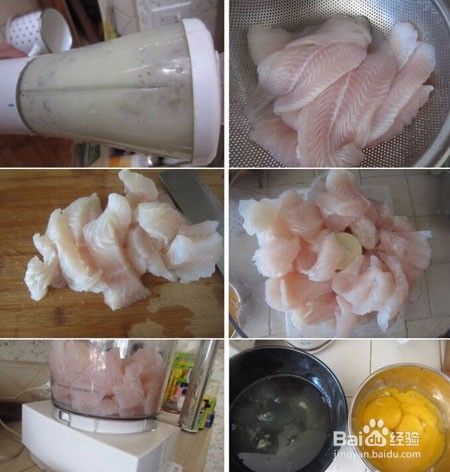 龙利鱼片去筋,切成大块,鸡蛋清和鸡蛋黄分开(蛋黄别扔,后面有用)。姜葱泥,鱼块,鸡蛋清放入blender(中文叫料理机?)高速打8-10分钟成鱼茸。
