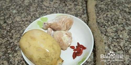 首先,准备一块莲藕、两个鸡腿、一根山药和若干枸杞。