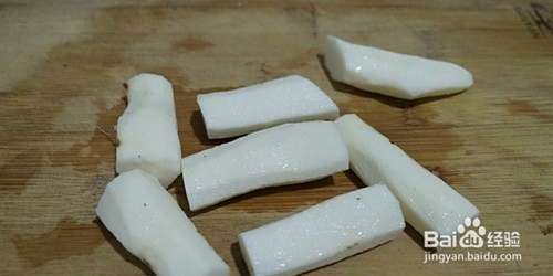 戴着手套,把山药去皮,洗干净,然后切成小段。