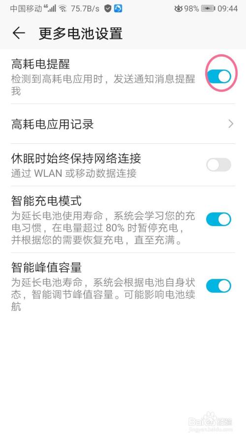 切换到更多电池设置的页面在高耗电提醒的功能点击【后面的按钮】。