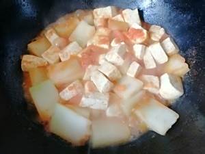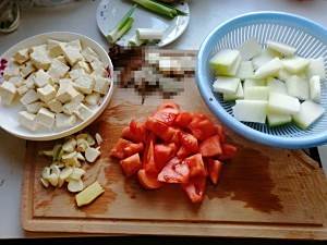 下入冬瓜,加开水,小火炖冬瓜至半透明,下入豆腐。期间加少许盐和味精调味。