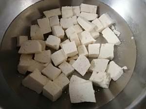 豆腐切小块焯水,加少许盐祛豆腥味。