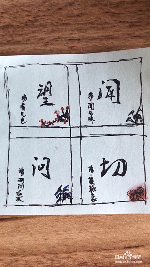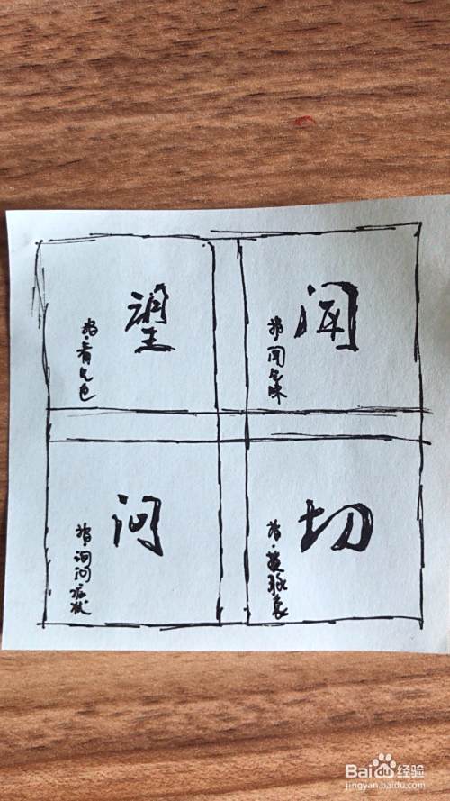 然后用笔在四个方框中分别写上“望、闻、问、切”四个字,并把字体描粗,看的更加醒目;