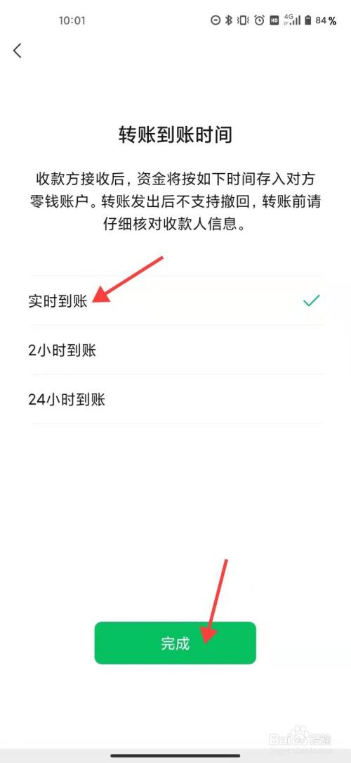 点击“转账到账时间”之后,勾选“实时到账”点击“完成”。