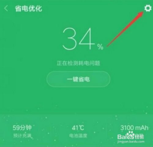 3、点开电量后会看到省电优化的页面,在这页面的右上角有个设置的按钮,点击打开它。