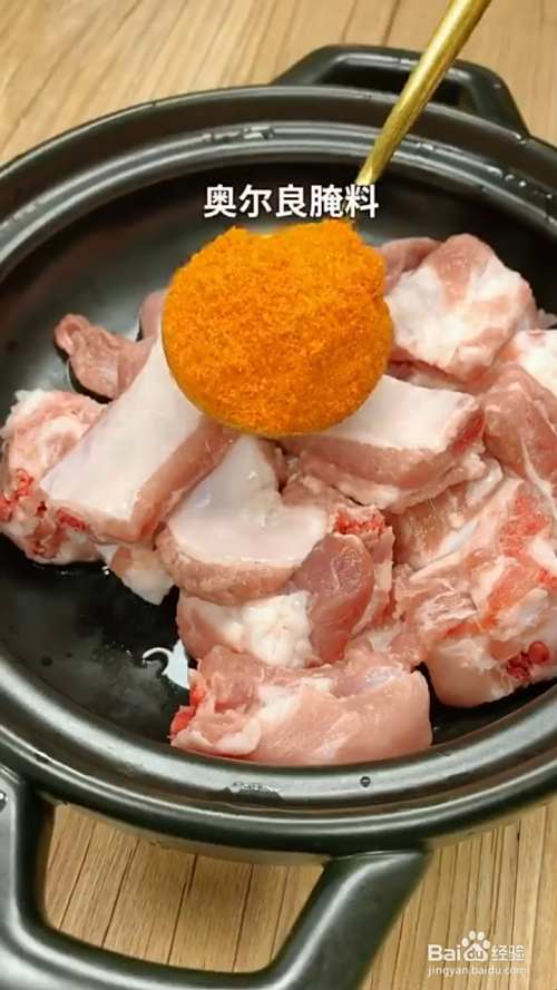 排骨切块加入一勺奥尔良腌料,一勺老抽上色,一勺料酒,一勺姜片,葱花,腌制半小时