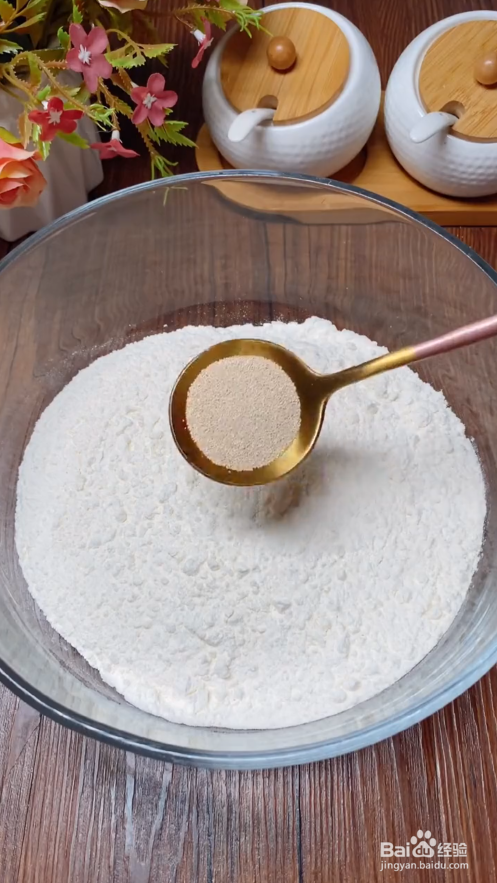 首先300克面粉加3克酵母粉,打入两个鸡蛋,加80克纯牛奶,搅成絮状,加20克玉米油。