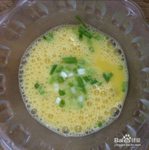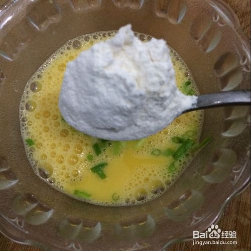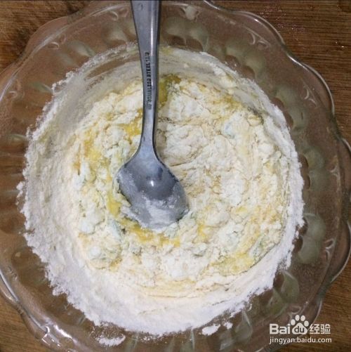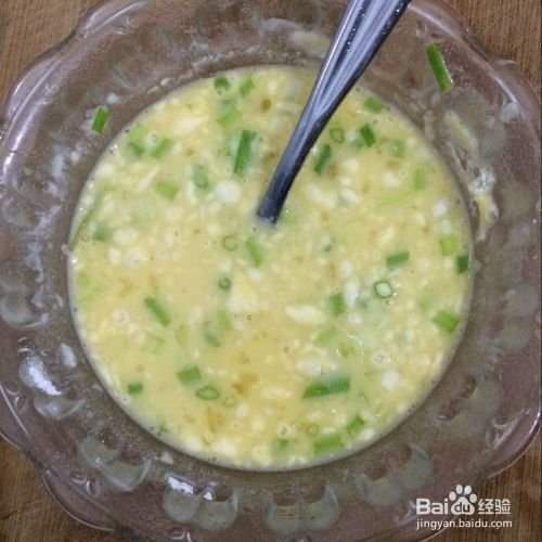 面粉一勺倒入鸡蛋液里,放盐和水调匀。把面粉里面的疙瘩全部压撒。