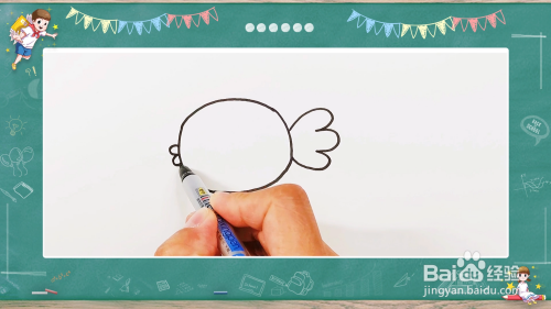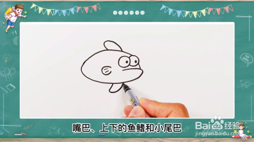 接下来在头的后面画上花边形的曲线作为鱼鳞,在身体上下都画出来鱼鳍,尾巴上画出线条,接着在嘴巴上方画几个小圈圈代表小鱼吐的泡泡。