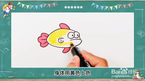 接下来用红色给鱼鳍和尾巴涂上颜色,身体用黄色上色,这样一条呆萌扁嘴鱼就完成啦。