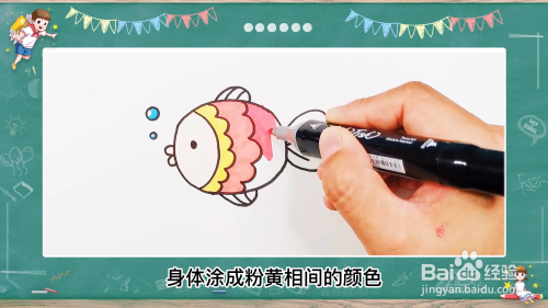最后给小鱼上色,泡泡涂成蓝色,头的部分用肤色涂满,身体涂成粉黄相间的颜色,鱼鳍用更浅一点的粉色涂满,尾巴涂上黄色就结束了。