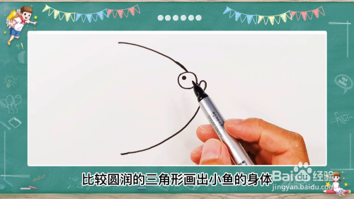 接下来在小鱼三角形的身体部分画一个半圆就有了一个头,尾巴和身体部分都画几条直线。