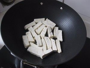 2.热锅放油勺八成热,下豆腐条,不要急着翻动。