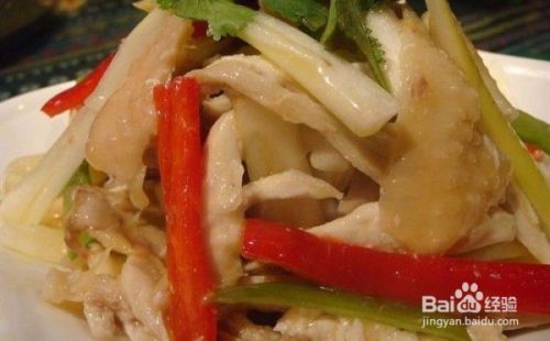 13.鸡凉了以后,用手撕出鸡肉,加洋葱丝、大葱、鸡汤汁、椒麻油、自制麻椒红油