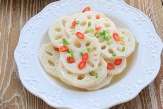 藕片先放在小盆里,加一勺盐颠几下,让盐均匀的附在藕片上,然后装在盘子里,香葱姜丝和红辣椒撒在藕片上。