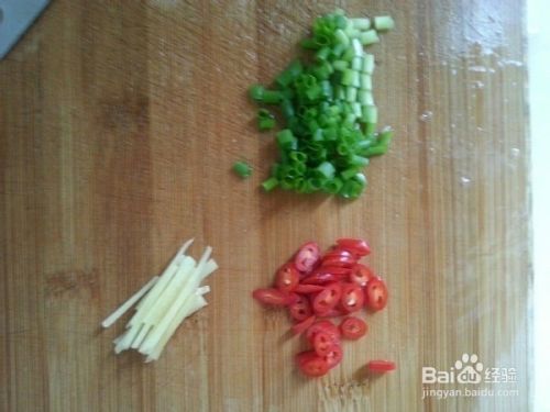 姜切丝,香葱切小段,红辣椒切段。(喜欢狠辣的口感的话可以选择小米辣,如果吃不了太辣的,可以选择长长的那种红辣椒,口感不是很辣)