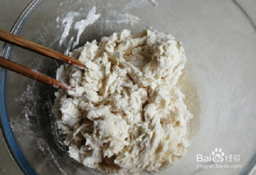 将搅拌好的酵母水倒入面粉里,搅拌成絮状。