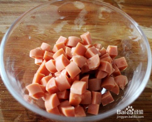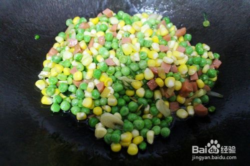 豌豆与火腿都放至一旁,放入玉米粒稍炒