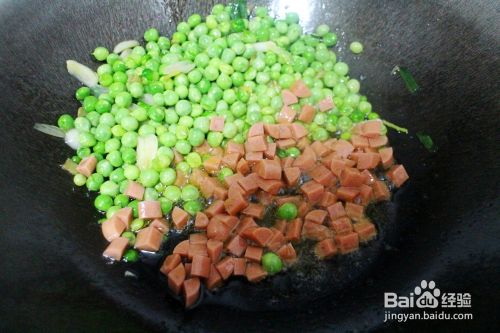待豌豆炒至八成熟,拔到一旁,放入火腿,火腿在油里炸至两面黄才有味
