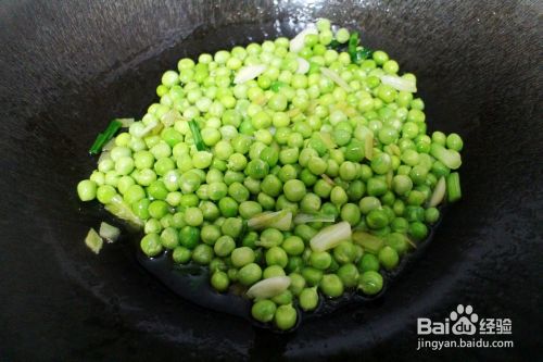 倒入豌豆一起炒,加少许盐,豌豆会更入味