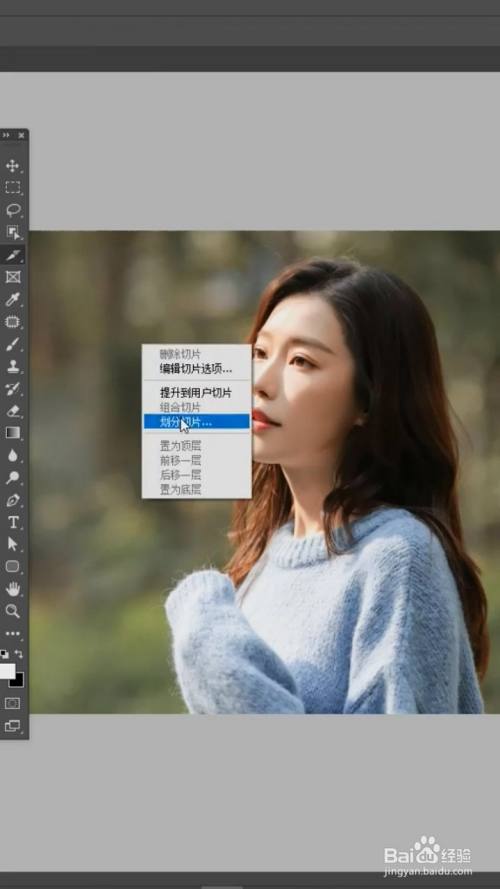 首先用裁剪工具把图片裁出一个正方形,然后点击“切片工具”,右键选择“划分切片”,“水平划分”设置3,勾选“垂直划分”,数值为3,点击确定。