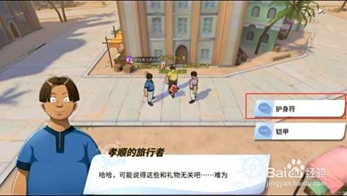 孝顺的旅行者准备给年龄较大的母亲带个礼物,推荐护身符即可。护身符是刚才走丢小女孩母亲送的,得先完成那个任务。