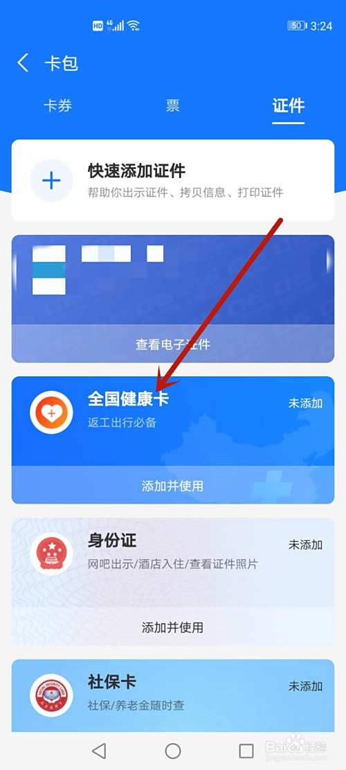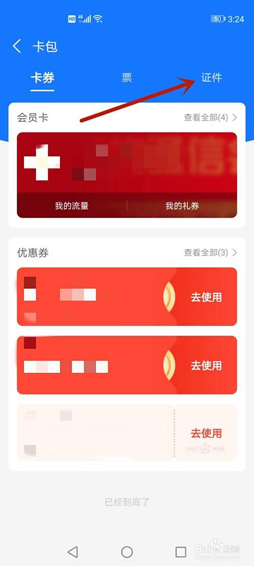 在卡包内,点击【证件】。