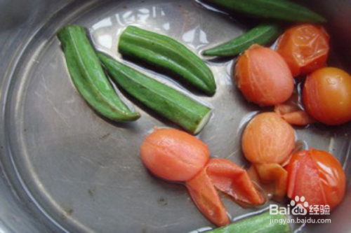 番茄打十字刀,秋葵洗净入沸水中焯20秒捞出。