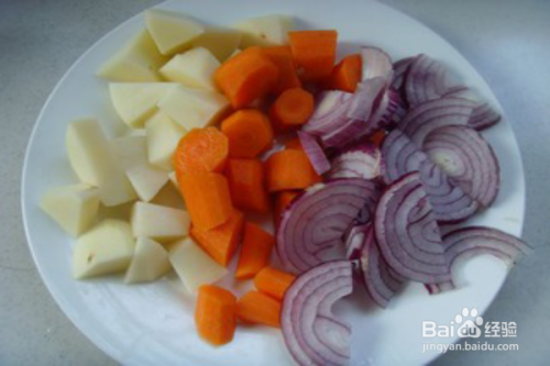 马铃薯、胡萝卜洗净去皮切滚刀块,洋葱去皮切丝。