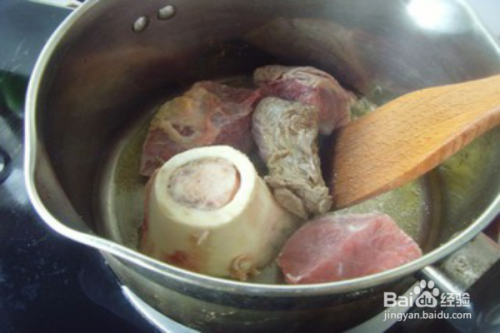 锅置火上适量橄榄油烧热,下入牛肉、牛骨略翻炒至变色。