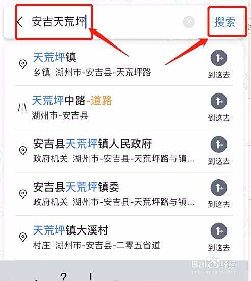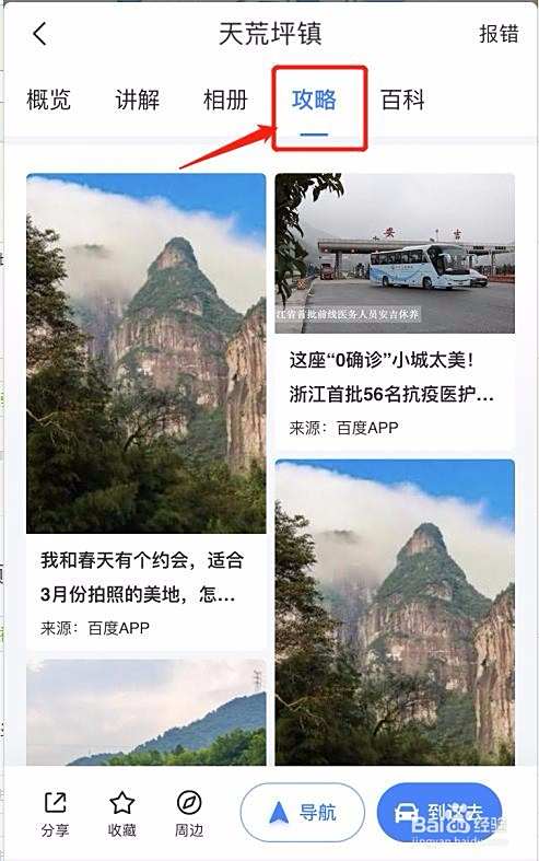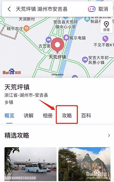 在搜索结果中点击安吉天荒坪的地址,切换到下图所示的界面,点【攻略】。